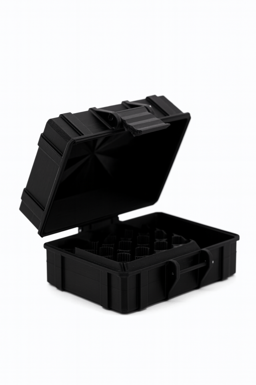 Black vial storage case with a lid open on a white background