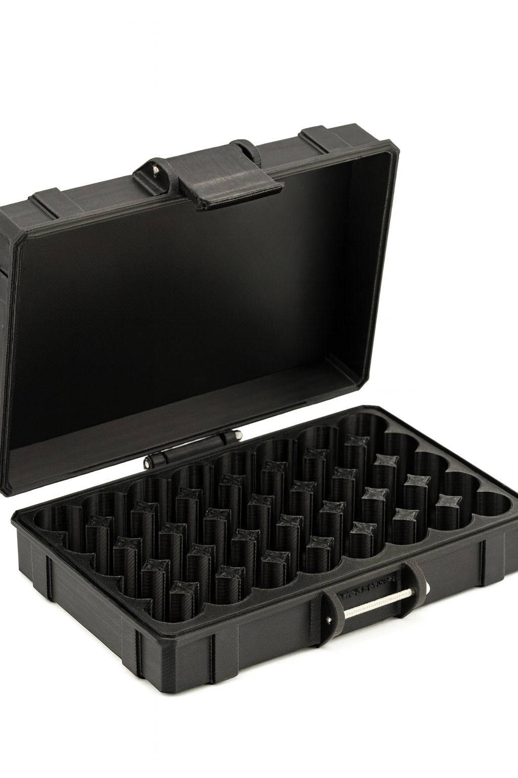 Black vial storage case with a lid open on a white background